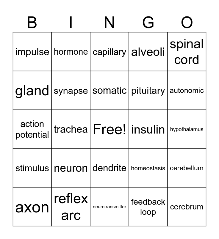 This bingo card has a free space and 24 words: neuron, reflex arc, somatic, axon, spinal cord, impulse, gland, hormone, insulin, dendrite, pituitary, action potential, homeostasis, cerebellum, synapse, feedback loop, hypothalamus, capillary, autonomic, trachea, cerebrum, stimulus, alveoli and neurotransmitter.