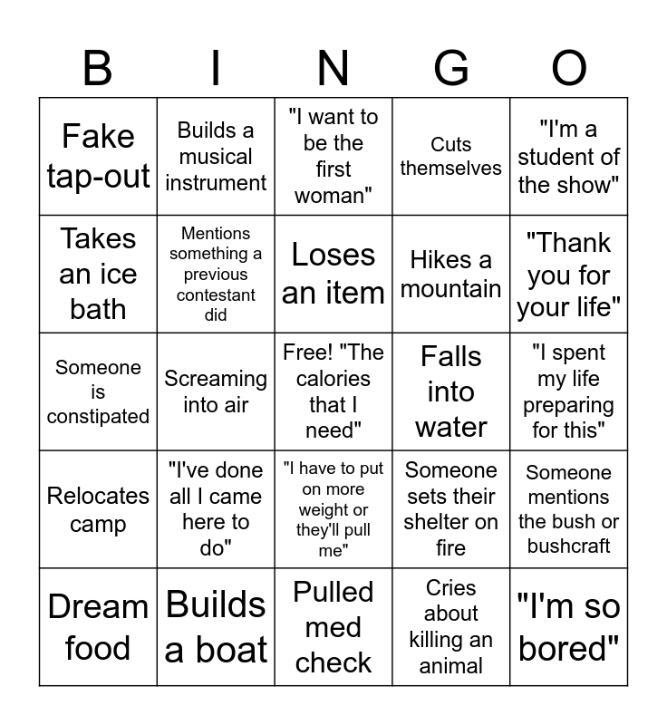 This bingo card has a free space and 24 words: "I've done all I came here to do", Builds a boat, Loses an item, Dream food, "I'm a student of the show", Fake tap-out, Takes an ice bath, Builds a musical instrument, Falls into water, "I have to put on more weight or they'll pull me", Hikes a mountain, Someone is constipated, Someone sets their shelter on fire, Someone mentions the bush or bushcraft, Mentions something a previous contestant did, Cries about killing an animal, "I spent my life preparing for this", "I want to be the first woman", "Thank you for your life", Screaming into air, "I'm so bored", Relocates camp, Cuts themselves and Pulled med check.