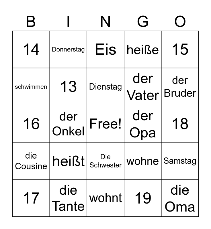 This bingo card has a free space and 29 words: 17, die Mutter, der Onkel, Montag, 14, Eis, 13, heißt, der Opa, die Tante, 18, die Oma, wohnt, 19, der Bruder, der Cousin, Die Schwester, die Cousine, 15, 16, wohne, 20, der Vater, schwimmen, heiße, Donnerstag, Samstag, Dienstag and Mittwoch.