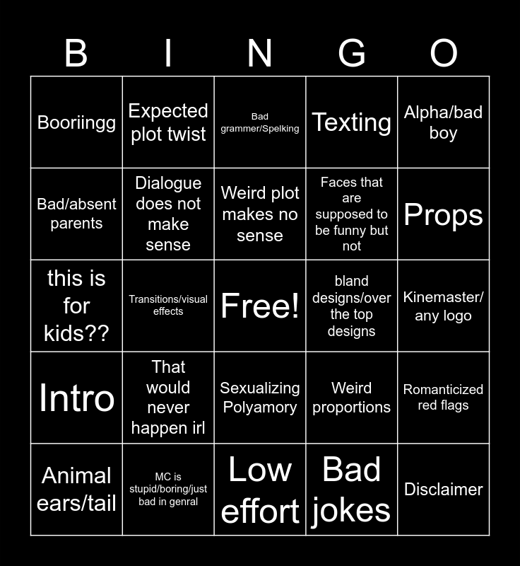 This bingo card has a free space and 24 words: That would never happen irl, MC is stupid/boring/just bad in genral, Weird plot makes no sense, Animal ears/tail, Alpha/bad boy, Booriingg, Bad/absent parents, Expected plot twist, bland designs/over the top designs, Sexualizing Polyamory, Faces that are supposed to be funny but not, this is for kids??, Weird proportions, Romanticized red flags, Dialogue does not make sense, Bad jokes, Kinemaster/ any logo, Bad grammer/Spelking, Props, Transitions/visual effects, Disclaimer, Intro, Texting and Low effort.