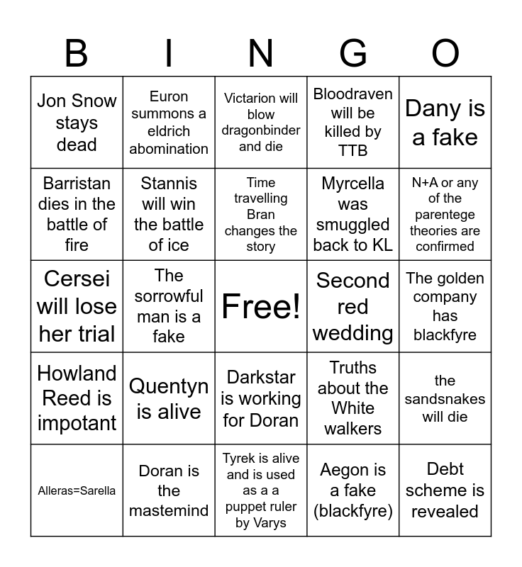 This bingo card has a free space and 24 words: Quentyn is alive, Doran is the mastemind, Time travelling Bran changes the story, Alleras=Sarella, Dany is a fake, Jon Snow stays dead, Barristan dies in the battle of fire, Euron summons a eldrich abomination, Second red wedding, Darkstar is working for Doran, Myrcella was smuggled back to KL, Cersei will lose her trial, Truths about the White walkers, the sandsnakes will die, Stannis will win the battle of ice, Aegon is a fake (blackfyre), The golden company has blackfyre, Victarion will blow dragonbinder and die, N+A or any of the parentege theories are confirmed, The sorrowful man is a fake, Debt scheme is revealed, Howland Reed is impotant, Bloodraven will be killed by TTB and Tyrek is alive and is used as a a puppet ruler by Varys.