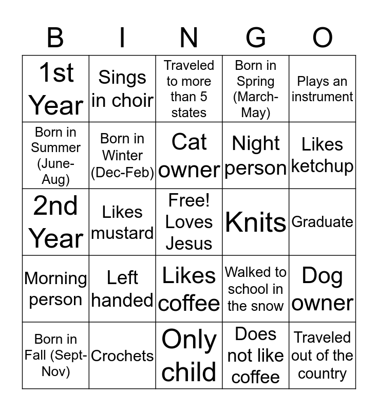 This bingo card has a free space and 24 words: Left handed, Crochets, Cat owner, Born in Fall (Sept-Nov), Plays an instrument, 1st Year, Born in Summer (June-Aug), Sings in choir, Knits, Likes coffee, Night person, 2nd Year, Walked to school in the snow, Dog owner, Born in Winter (Dec-Feb), Does not like coffee, Graduate, Traveled to more than 5 states, Likes ketchup, Likes mustard, Traveled out of the country, Morning person, Born in Spring (March-May) and Only child.