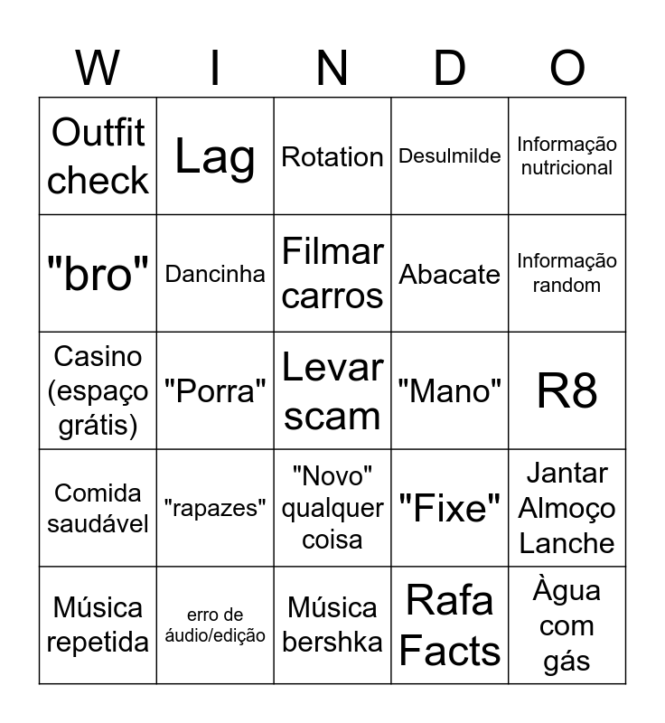 This bingo card has a free space and 24 words: "rapazes", erro de áudio/edição, Filmar carros, Música repetida, Informação nutricional, Outfit check, "bro", Lag, "Mano", "Novo" qualquer coisa, Abacate, Casino (espaço grátis), "Fixe", Jantar Almoço Lanche, Dancinha, Rafa Facts, R8, Rotation, Informação random, "Porra", Àgua com gás, Comida saudável, Desulmilde and Música bershka.