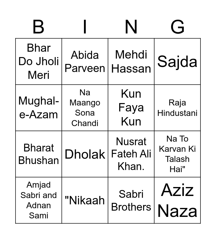 This bingo card has 19 words: Nusrat Fateh Ali Khan., Amar Akbar Anthony, Mehdi Hassan, Aziz Naza, Na To Karvan Ki Talash Hai", Mughal-e-Azam, Sabri Brothers, Bhar Do Jholi Meri, Abida Parveen, Bharat Bhushan, Dholak, Na Maango Sona Chandi, Kun Faya Kun, "Nikaah, Amjad Sabri and Adnan Sami, Rishi Kapoor, Sajda, Raja Hindustani and A.R. Rahman.