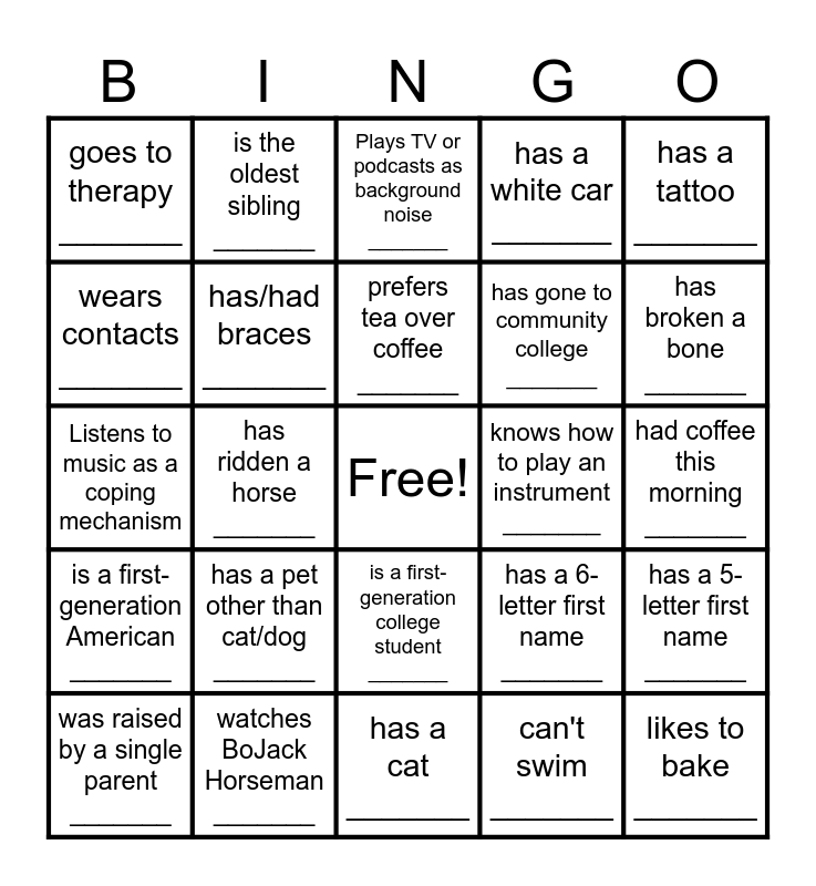 This bingo card has a free space and 49 words: is left-handed _______, likes to bake _______, has a dog _______, has a cat _______, has a pet other than cat/dog _______, is an only child _______, is the oldest sibling _______, is the youngest sibling _______, wears contacts _______, likes pineapple on pizza _______, has/had braces _______, has a white car _______, has a 5-letter first name _______, has a 6-letter first name _______, speaks more than one language _______, was born outside of NC _______, prefers tea over coffee _______, knows how to play an instrument _______, knows how to play chess _______, has a tattoo _______, has ridden a horse _______, can't swim _______, goes to therapy _______, has gone to community college _______, enjoys thrifting _______, has broken a bone _______, was raised by a single parent _______, transferred to NCSU from a different school _______, is a first-generation college student _______, is a first-generation American _______, has traveled to a different country _______, has gone bungee jumping or skydiving _______, loves Autumn _______, watches New Girl _______, watches BoJack Horseman _______, has a chronic illness _______, is queer _______, is planning to pursue higher education _______, had coffee this morning _______, has an Apple watch _______, has an Android phone _______, has a collection of something _______, has attended a support group _______, identifies as the "peacemaker" _______, Listens to music as a coping mechanism, Plays TV or podcasts as background noise _______, has attended a funeral _______, has attended a wedding _______ and is/has been in a long term-relationship _______.
