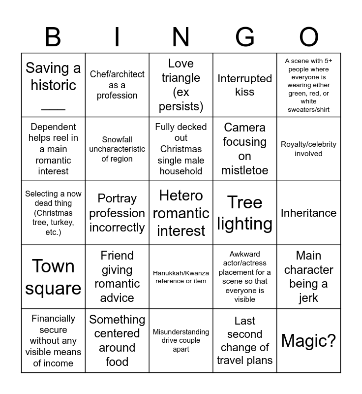 This bingo card has a free space and 24 words: Friend giving romantic advice, Something centered around food, Fully decked out Christmas single male household, Financially secure without any visible means of income, A scene with 5+ people where everyone is wearing either green, red, or white sweaters/shirt, Saving a historic ___, Dependent helps reel in a main romantic interest, Chef/architect as a profession, Tree lighting, Hanukkah/Kwanza reference or item, Camera focusing on mistletoe, Selecting a now dead thing (Christmas tree, turkey, etc.), Awkward actor/actress placement for a scene so that everyone is visible, Main character being a jerk, Snowfall uncharacteristic of region, Last second change of travel plans, Inheritance, Love triangle (ex persists), Royalty/celebrity involved, Portray profession incorrectly, Magic?, Town square, Interrupted kiss and Misunderstanding drive couple apart.