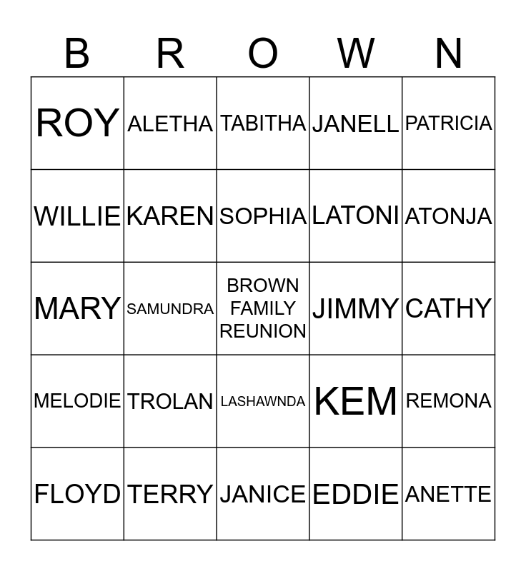 This bingo card has a free space and 24 words: TROLAN, TERRY, SOPHIA, FLOYD, PATRICIA, ROY, WILLIE, ALETHA, JIMMY, LASHAWNDA, LATONI, MARY, KEM, REMONA, KAREN, EDDIE, CATHY, TABITHA, ATONJA, SAMUNDRA, ANETTE, MELODIE, JANELL and JANICE.