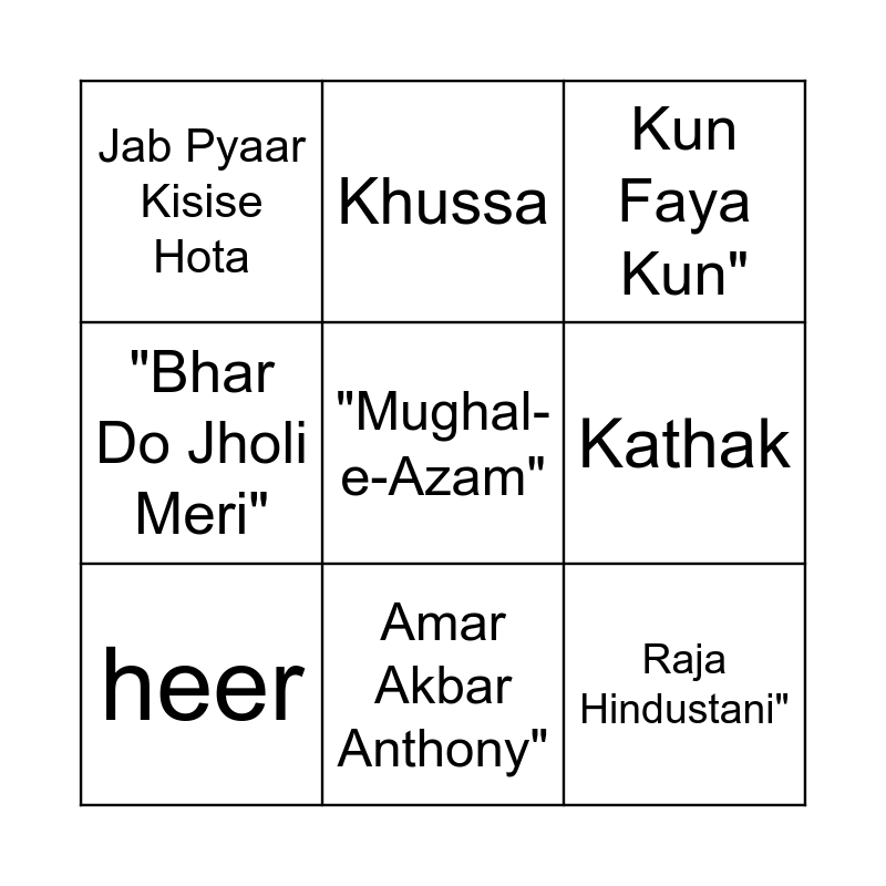 This bingo card has a free space and 42 words: Amar Akbar Anthony" Mehdi Hassan Aziz Naza Na To Karvan Ki Talash Hai" "Mughal-e-Azam" Sabri Brothers "Bhar Do Jholi Meri" Abida Parveen Bharat Bhushan Dholak "Na Maango Sona Chandi" Ustad Nusrat Fateh Ali Khan Kun Faya Kun" Nikaah" Amjad Sa, Amar Akbar Anthony", Mehdi Hassan, Na To Karvan Ki Talash Hai", Bharat Bhushan, Dholak, "Na Maango Sona Chandi", Ustad Nusrat Fateh Ali Khan, Kun Faya Kun", Nikaah", Amjad Sabri and Adnan Sami, Rishi Kapoor, Sajda", Raja Hindustani", A.R. Rahman, "Chandni, "Banno, Dafli (or Daf), Sun Zara, Khussa, Kathak, Banno, "Dharam Veer", Jab Pyaar Kisise Hota, "Dil Ki Yeh Arzoo Thi", tabla, Main Hoon Na, urdu, indu sarkar, Ghulam Farid Sabri, kurta pyjama, Amitabh Bachchan, heer, Dil To Bacha Hai Ji, Amar Akbar Anthony", Mehdi Hassan, Aziz Naza, Na To Karvan Ki Talash Hai", "Mughal-e-Azam", Sabri Brothers, "Bhar Do Jholi Meri" and Abida Parveen.