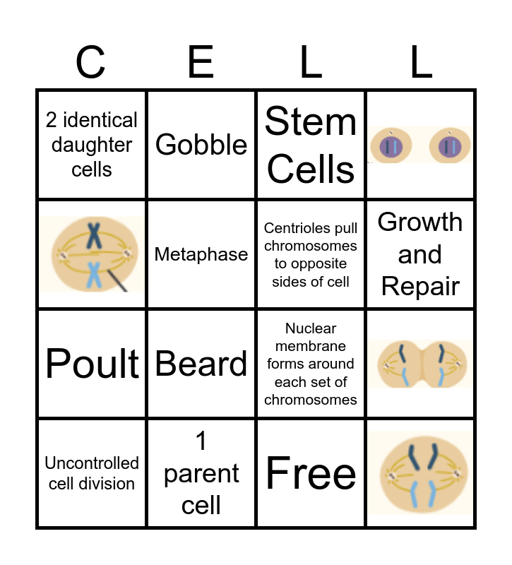 This bingo card has 6 images and 35 words: Nuclear membrane forms around each set of chromosomes, Centrioles pull chromosomes to opposite sides of cell, Chromosomes and centrioles replicate, Nuclear membrane completely disappears, Growth and Repair, Chromosome pairs line up at cell equator, Uncontrolled cell division, Free, 1 parent cell, cancer, Body Cells, 2 identical daughter cells, DNA, Stem Cells, Turkey, Tom, Hen, Poult, Wattle, Tan with brown specks, 28 days, Avian influenza, Beard, Can not fly, Can fly, Gobble, Cytokinesis, Prophase, Interphase, Metaphase, Anaphase, Telophase, Cell Cycle, Cell Division and Mitosis.