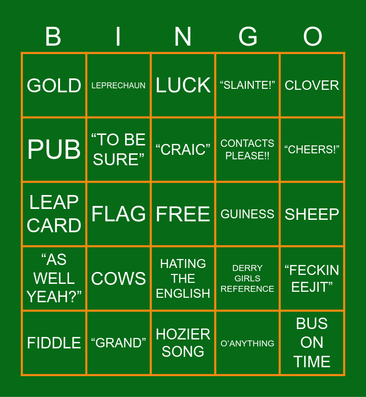 This bingo card has a free space and 24 words: FIDDLE, COWS, “CRAIC”, O’ANYTHING, CLOVER, GOLD, LEPRECHAUN, LUCK, GUINESS, SHEEP, LEAP CARD, “TO BE SURE”, DERRY GIRLS REFERENCE, “FECKIN EEJIT”, PUB, “GRAND”, HOZIER SONG, “SLAINTE!”, “CHEERS!”, “AS WELL YEAH?”, FLAG, HATING THE ENGLISH, CONTACTS PLEASE!! and BUS ON TIME.