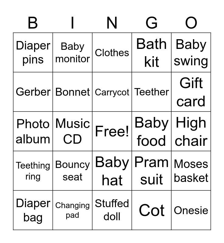 This bingo card has a free space and 69 words: Blankie, High chair, Teddy bear, Rubber duck, Changing pad, Baby shirt, Bath kit, Baby powder, Baby swing, Play gym, Moses basket, Blankets, Diaper pins, Clothes, Bib, Music CD, Baby hat, Teether, Bottle, Teething ring, Baby food, Pram suit, Gift card, Memory journal, Baby walker, Toy box, Diapers, Baby food blend, Cot, Stroller, Baby monitor, Layette, Baby lotion, Towel, Playpen, Bassinet, Mobiles, Baby socks, Gerber, Baby book, Bouncy seat, Onesie, Baby shampoo, Cradle, Blanket sleeper, Diaper bag, Burp cloth, Picture frame, Bottle rack, Bonnet, Carrycot, Security blanket, Pacifier, Stuffed doll, Mittens, Hooded towel, Sippy cup, Baby bathtub, Sleep sack, Photo album, Booties, Alphabet blocks, Wipes, Baby sling, Baby carrier, Formula, Playsuit, Rattle and Baby cardigan.
