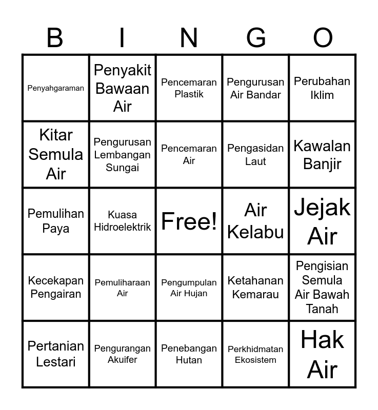 This bingo card has a free space and 24 words: Pemuliharaan Air, Pengurangan Akuifer, Pencemaran Air, Pertanian Lestari, Perubahan Iklim, Penyahgaraman, Kitar Semula Air, Penyakit Bawaan Air, Air Kelabu, Pengumpulan Air Hujan, Pengasidan Laut, Pemulihan Paya, Ketahanan Kemarau, Pengisian Semula Air Bawah Tanah, Pengurusan Lembangan Sungai, Perkhidmatan Ekosistem, Jejak Air, Pencemaran Plastik, Kawalan Banjir, Kuasa Hidroelektrik, Hak Air, Kecekapan Pengairan, Pengurusan Air Bandar and Penebangan Hutan.