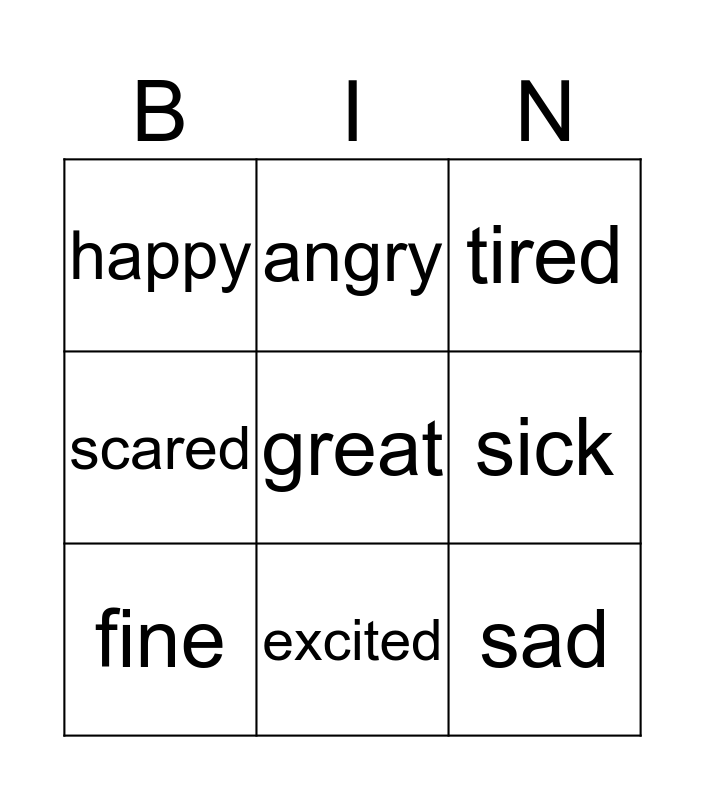This bingo card has a free space and 8 words: sick, tired, angry, fine, happy, sad, scared and excited.