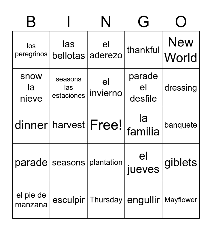 This bingo card has a free space and 151 words: America El América, autumn el otoño, colonists los colonos, to celebrate celebrar, family la familia, grandparents los abuelos, gratitude la gratitud, holiday la fiesta, home el hogar, leaves las hojas, November el noviembre, orchard la huerta, parade el desfile, to sail navegar, seasons las estaciones, snow la nieve, America, El América, autumn, el otoño, canoe, la canoa, colonists, los colonos, to celebrate, celebrar, family, la familia, grandparents, los abuelos, gratitude, la gratitud, holiday, la fiesta, home, el hogar, leaves, las hojas, Mayflower, la Mayflower, Native Americans, los nativos americanos, New World, el nuevo mundo, November, el noviembre, orchard, la huerta, parade, el desfile, pilgrims, los peregrinos, plantation, la plantación, planting, el plantando, Puritans, los Puritanos, religion, la religión, to sail, navegar, seasons, las estaciones, snow, la nieve, thankful, agradecido, Thanksgiving, la Acción de gracias, Thursday, el jueves, tradition, la tradición, travel, el viaje, treaty, el tratado, winter, el invierno, Food and Cooking, English, Spanish, acorns, las bellotas, apple pie, el pie de manzana, to bake, hornear, to baste, hilvanar, bread, el pan de molde, to carve, esculpir, casserole, la cazuela, centerpiece, el centro de mesa, cider, la sidra, to cook, cocinar, corn, el maíz, cornbread, el pan de maíz, cornucopia, el cuerno de la abundancia, cranberries, los arándanos, delicious, delicioso, dessert, el postre, dinner, la cena, dish, el plato, dressing, el aderezo, drumstick, la pierna, to eat, comer, feast, banquete, giblets, los menudillos, to gobble, engullir, gravy, la salsa, ham, el jamón, harvest, la cosecha, leftovers, las sobras, corn el maíz, meal la comida, to nap la siesta, napkin la servilleta, pie la tarta, plate el plato, pumpkin la calabaza, recipe la receta, stuffing el relleno, sweet potato el camote, turkey el pavo and vegetables los vegetales.