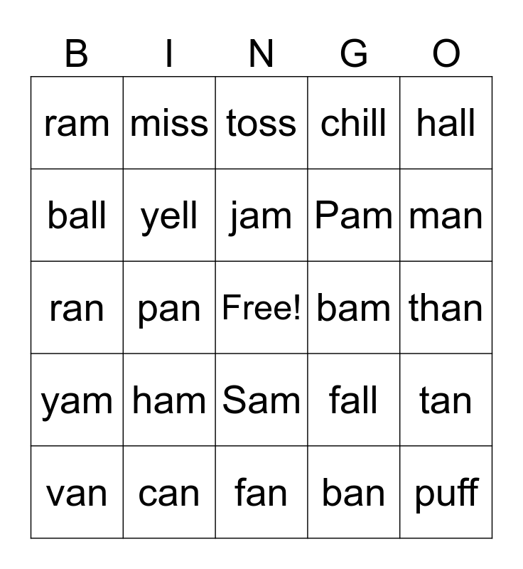 This bingo card has a free space and 24 words: ham, can, jam, van, hall, ram, ball, miss, bam, Sam, Pam, ran, fall, tan, yell, ban, than, toss, man, pan, puff, yam, chill and fan.