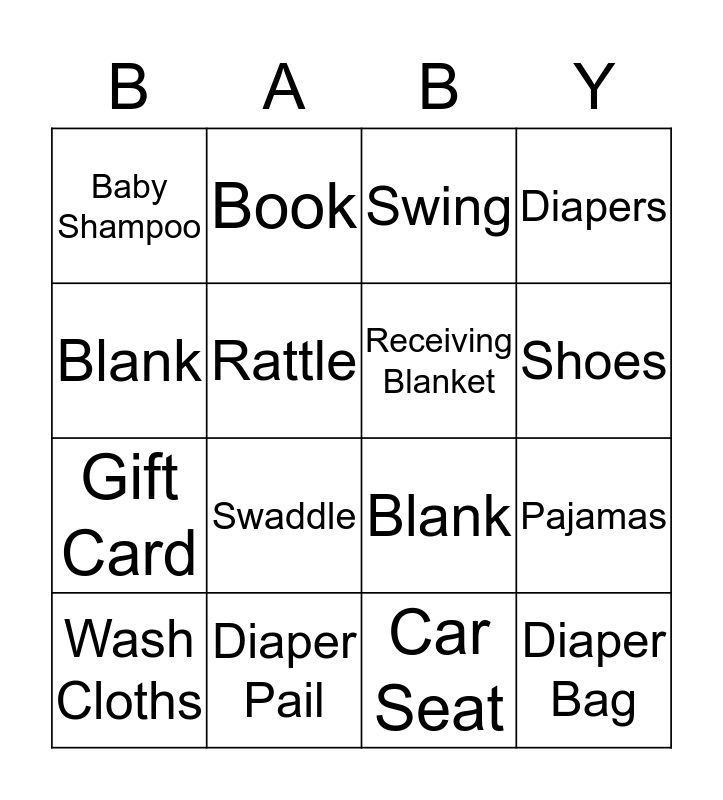 This bingo card has a free space and 15 words: Wash Cloths, Diaper Bag, Swing, Baby Shampoo, Shoes, Blank, Swaddle, Car Seat, Rattle, Gift Card, Pajamas, Diapers, Receiving Blanket, Book and Diaper Pail.