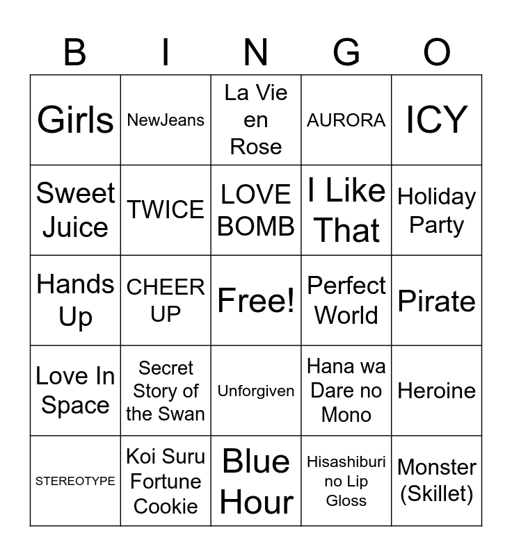 This bingo card has a free space and 200 words: Love Dive, Eleven, After Like, GingaMingaYo (the strange world), RING Ma Bell (what a wonderful world), TOMBOY, Attention, Nemo Hamo Rumor, Everyday, Katyuusha, I Like That, WA DA DA, We Fresh, Last Sequence, BUTTERFLY, Cameo, Want you ! Want you !, Weekend Citron, Teokure Caution, Beat Generation, Kiara Tiara, Scream, Chocolate Melancholy, Chou Kodoku Lion, Moto Kare Desu, Koi Suru Fortune Cookie, Flying Get, Biisan wa Naze Naku Naru no ka?, Kimi wa Motto Dekiru, Hana wa Dare no Mono, Shukko, ASAP, STEREOTYPE, Stamp On It, DICE, Teddy Bear, ANTIFRAGILE, SHUT DOWN, Savage, GHOST, SO BAD, O.O, Kawaikute Gomen, Up!, FEARLESS, No Celestial, OMG, Ditto, Not Shy, LOCO, WANNABE, ICY, AURORA, Hands Up, Love In Space, Love So Sweet, Hisashiburi no Lip Gloss, Ano ko Complex, I CAN’T STOP ME, FANCY, CRY FOR ME, Likey, YES or YES, MORE & MORE, I Can’t Decide, Catch Me, Abracadabra, Uh-Oh, ROYAL, Odd Eye, MAISON, VISION, Ma Boy, Sweet Juice, YOU&I, Monster (EXO), Left & Right, Blue Hour, FAKE LOVE, Hyalulonely Girl, Tenshi wa Doko e, Girls, I AM, Boulevard of Broken Dreams, My Satisfaction, Russian Roulette, LOVE BOMB, Crazy, Feel My Rhythm, LAST WALTZ, MOONLIGHT SUNRISE, SET ME FREE, SCIENTIST, Feel Special, TT, CHEER UP, Like Ooh-Ahh, Secret Story of the Swan, Love Shake, POPPY, LIMBO!, Doushitemo Kimi ga Suki da, RUN2U, Kono Sora ga Trigger, Junkies, In the morning, Pirate, Panorama, LION, La Vie en Rose, Vampire, Buenos Aires, Next Level, Psycho, Queendom, UNNATURAL, Boogie Up, Bad Boy, MASAYUME CHASING, Blueming, Picky Picky, Oh! My Mistake, LALALILALA, Sagase Diamond Lily, Iranai Twintail, Perfect World, RICA RICA, Deja Vu, DAZZLE DAZZLE, WAVE, Giddy, EUNOIA, BEcause, Save Me, Save You, BOCA, After School, Tag Me (@Me), Holiday Party, Ven para, Zig Zag, Take It, Blue Blood, BONVOYAGE, Lips, Heroine, Mine, Hypnosis, NOT YOUR GIRL, Next Page, Cherish, Shine With Me, Love Me Like This, As You Wish, Teacher Teacher, Hype Boy, Eve, Psyche, & The Bluebeard’s Wife, Queencard, Allergy, ≒JOY, Sweet Sixteen!, Waratte Fragile, Kyou mo Kimi no Yume wo Mitanda, POP!, Secret, Dreams Come True, Natsumatope, =LOVE (Song), Super Shy, Cherry Bomb, Kitsch, Omowase Burikko, Either Way, Baddie, Off The Record, Last Note Shika Shiranai, BBIBBI, Gurenge, Fantastic Baby, HIP, Miniskirt, How Dare You, Love Shot, JACKPOT, Devil, Could Have Been Me, Monster (Skillet), Nxde, Unforgiven, IVE, Dreamcatcher, =LOVE, WJSN, TWICE, NewJeans, AKB48, Weeekly, ITZY, (G)I-DLE, LE SSERAFIM, Not K-pop/J-pop and From A Movie.