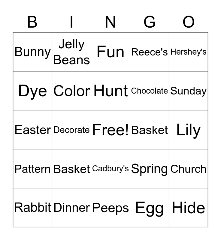 This bingo card has a free space and 24 words: Basket, Dinner, Hunt, Rabbit, Hershey's, Bunny, Dye, Jelly Beans, Basket, Cadbury's, Chocolate, Easter, Spring, Church, Color, Egg, Lily, Fun, Sunday, Decorate, Hide, Pattern, Reece's and Peeps.