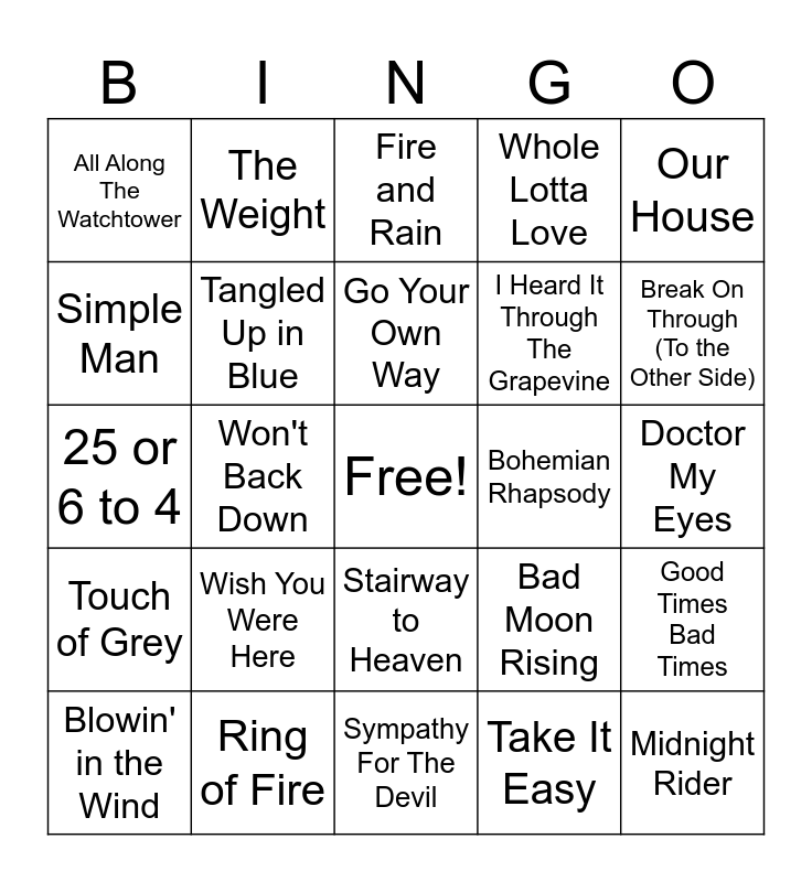 This bingo card has a free space and 55 words: A Day In The Life, Blowin' in the Wind, Good Vibrations, All Along The Watchtower, Sympathy For The Devil, Suspicious Minds, Tangled Up in Blue, Little Wing, I Heard It Through The Grapevine, California Dreamin', Whole Lotta Love, Paint It Black, Revolution, You Can't Always Get What You Want, Reeling in the Years, Bad Bad Leroy Brown, Our House, Won't Back Down, Ripple, Midnight Rider, Bohemian Rhapsody, Sunshine on my Shoulders, Bad Moon Rising, Fire and Rain, Vienna, Go Your Own Way, Take It Easy, House of the Rising Sun, Doctor My Eyes, Good Times Bad Times, Love Me Tender, Pretty Woman, Folsom Prison Blues, Fly Like an Eagle, Simple Man, 25 or 6 to 4, Piece of My Heart, Touch of Grey, Suite Judy Blue Eyes, Beast of Burden, The Weight, Have You Ever Seen the Rain, Hey Jude, Dirty Work, Wish You Were Here, Ring of Fire, Sunshine of Your Love, You're So Vain, Purple Haze, Break On Through (To the Other Side), Brown Eyed Women, Take the Money and Run, L.A. Woman, Stairway to Heaven and Listen to the Music.