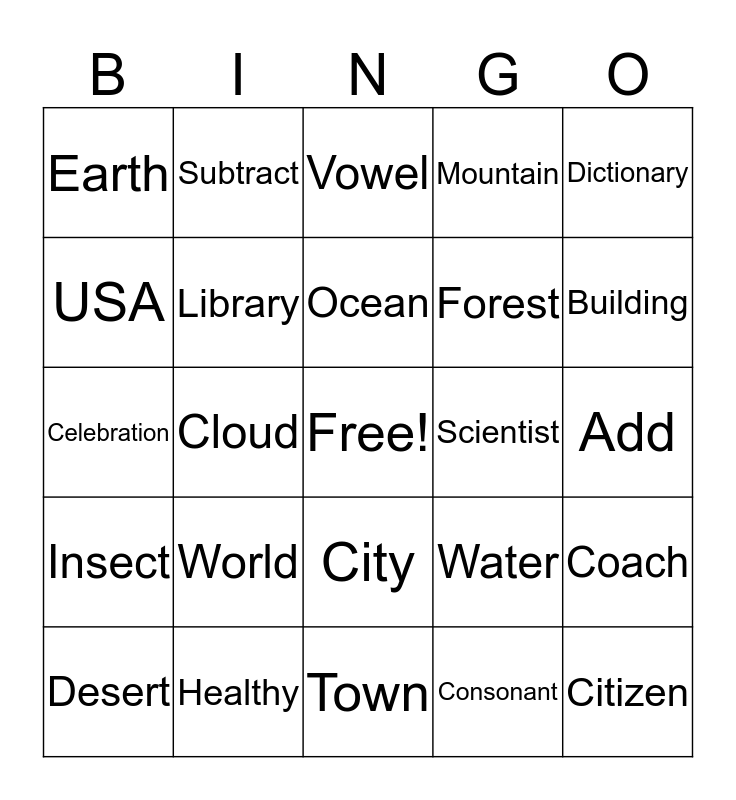 This bingo card has a free space and 24 words: World, Healthy, Ocean, Desert, Dictionary, Earth, USA, Subtract, Scientist, City, Forest, Celebration, Water, Coach, Library, Consonant, Add, Vowel, Building, Cloud, Citizen, Insect, Mountain and Town.