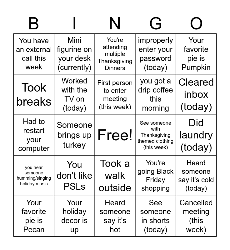 This bingo card has a free space and 24 words: You don't like PSLs, Your holiday decor is up, First person to enter meeting (this week), Your favorite pie is Pecan, Your favorite pie is Pumpkin, You have an external call this week, Took breaks, Mini figurine on your desk (currently), See someone with Thanksgiving themed clothing (this week), Took a walk outside, you got a drip coffee this morning, Had to restart your computer, You're going Black Friday shopping, Heard someone say it's cold (today), Worked with the TV on (today), See someone in shorts (today), Did laundry (today), You're attending multiple Thanksgiving Dinners, Cleared inbox (today), Someone brings up turkey, Cancelled meeting (this week), you hear someone humming/singing holiday music, improperly enter your password (today) and Heard someone say it's hot.