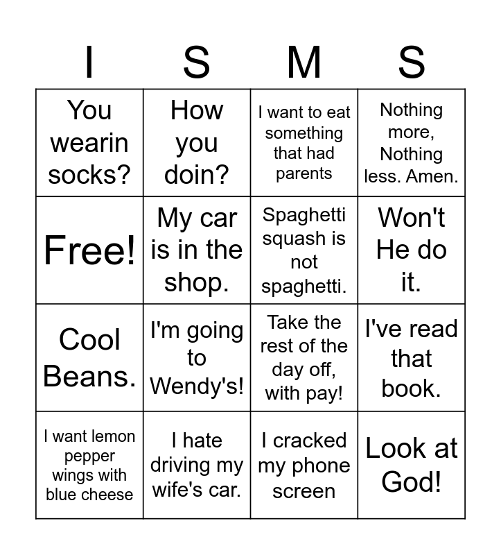 This bingo card has 16 words: I hate driving my wife's car., I've read that book., I want to eat something that had parents, You wearin socks?, Cool Beans., How you doin?, Take the rest of the day off, with pay!, I cracked my phone screen, Free!, My car is in the shop., I want lemon pepper wings with blue cheese, Nothing more, Nothing less. Amen., I'm going to Wendy's!, Won't He do it., Spaghetti squash is not spaghetti. and Look at God!.