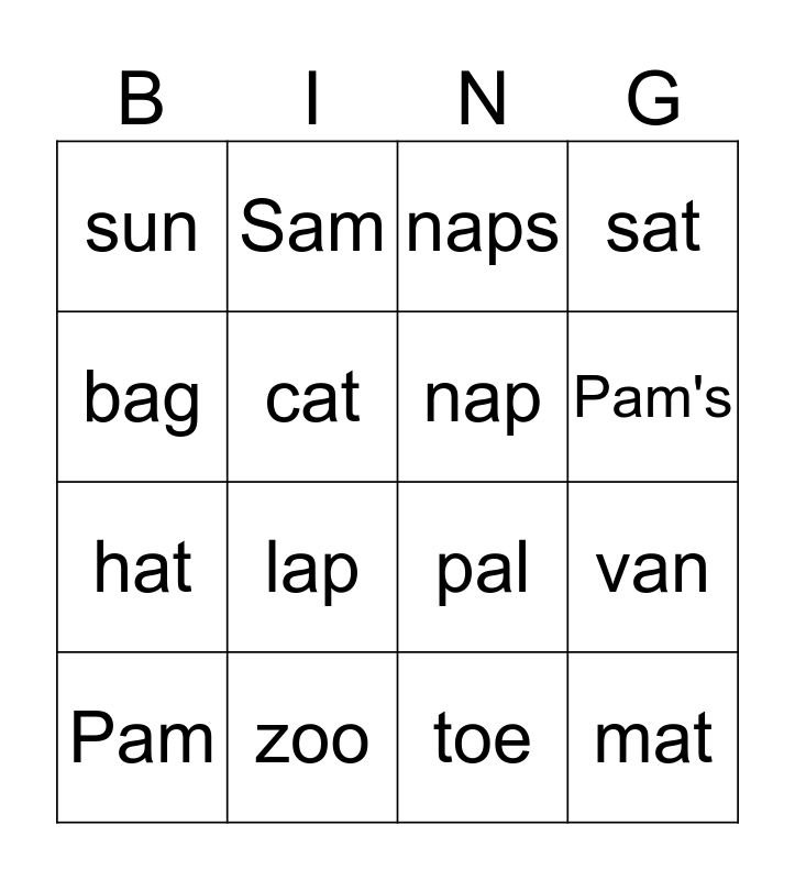 This bingo card has a free space and 15 words: Pam, mat, naps, sun, Pam's, bag, lap, toe, cat, hat, van, sat, nap, Sam and zoo.