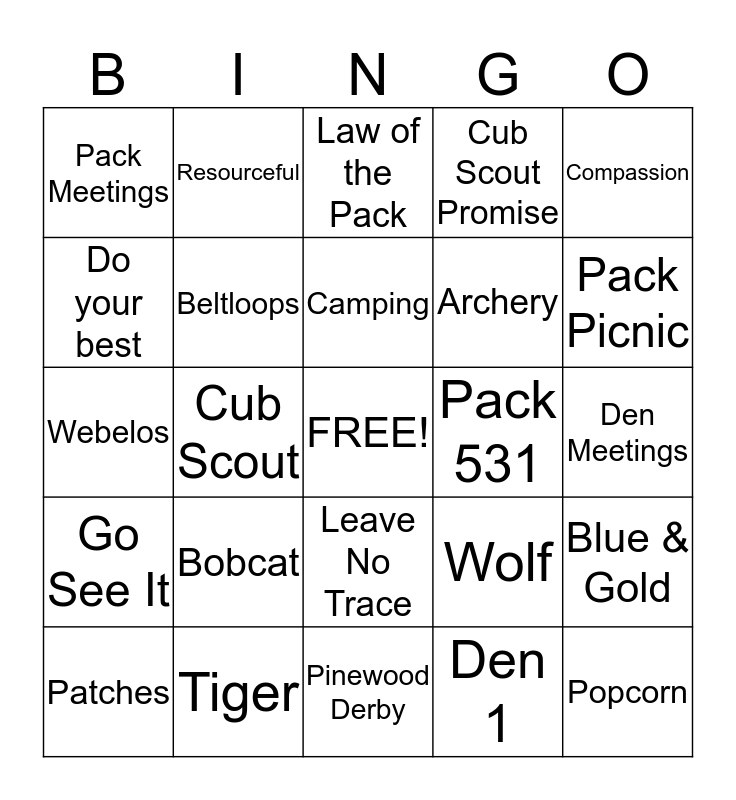 This bingo card has a free space and 37 words: Arrow of Light, Awards, Bear, Beltloops, Blue & Gold, Bobcat, Camping, Citizenship, Compassion, Courage, Cub Scout, Cub Scout Promise, Popcorn, Den Meetings, Do your best, Go See It, Honesty, Law of the Pack, Leave No Trace, Pack 531, Pack Meetings, Pack Picnic, Patches, Pinewood Derby, Raingutter Regatta, Den 1, Resourceful, Respect, Reverent, Skits, Songs, Tiger, Webelos, Whittling Chip, Wolf, Archery and BB Gun.