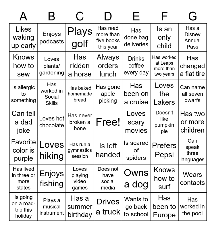 This bingo card has a free space and 48 words: Owns a dog, Has worked at Leaps more than two years, Drives a truck, Loves hot chocolate, Has baked homemade bread, Has two or more children, Enjoys podcasts, Plays a musical instrument, Is an only child, Is left handed, Has a Disney Annual Pass, Has read more than five books this year, Loves the Lakers, Has been on a cruise, Has lived in three or more states, Doesn't like pumpkin pie, Knows how to sew, Has changed a flat tire, Knows how to surf, Has done bag deliveries, Drinks coffee every day, Has never broken a bone, Likes waking up early, Loves plants/ gardening, Wears contacts, Has ridden a horse, Can name all seven dwarfs, Is going on a road-trip this holiday, Has gone apple picking, Has worked in Social Skills, Has been to Europe, Loves scary movies, Can speak three languages, Enjoys fishing, Can tell a dad joke, Is scared of spiders, Prefers Pepsi, Is allergic to something, Has run a gymnastics session, Loves playing video games, Favorite color is purple, Has worked in the pool, Plays golf, Has a summer birthday, Always orders lunch, Does not have social media, Loves hiking and Wants to go back to school.