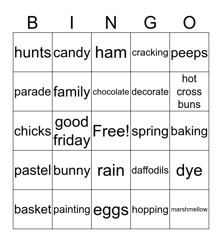 This bingo card has a free space and 25 words: bunny, eggs, chocolate, basket, peeps, hunts, parade, candy, spring, rain, decorate, chicks, daffodils, dye, family, bonnet, baking, ham, hot cross buns, good friday, marshmellow, painting, pastel, cracking and hopping.