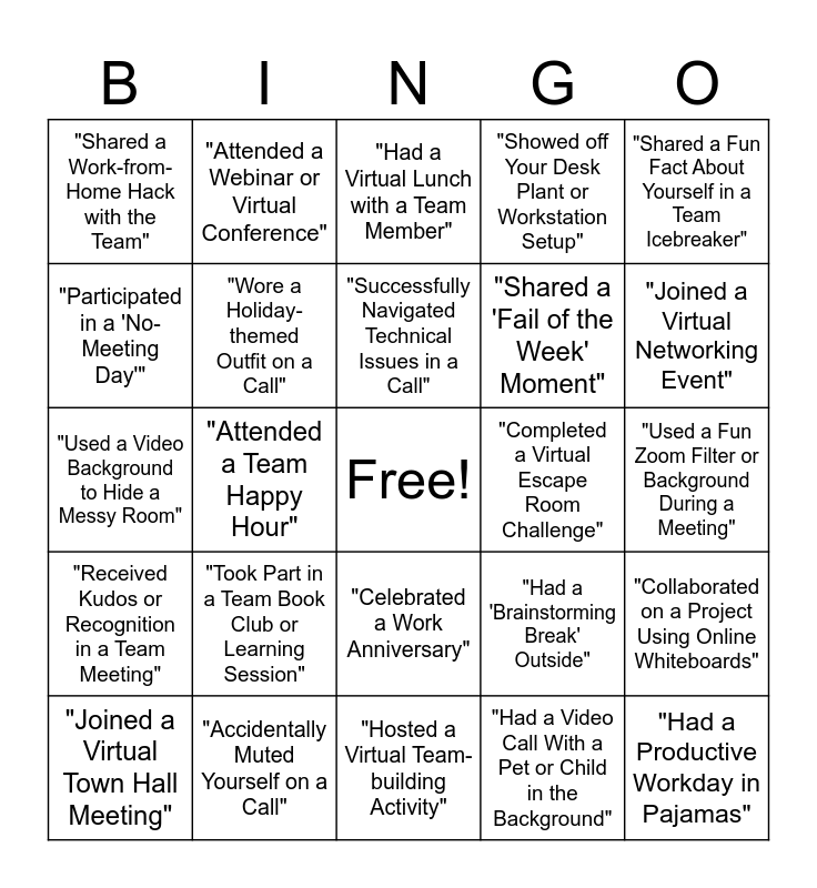 This bingo card has a free space and 30 words: "Accidentally Muted Yourself on a Call", "Sent a GIF or Emoji in a Professional Email", "Attended a Team Happy Hour", "Received a Compliment on Your Virtual Background", "Shared a Work-from-Home Hack with the Team", "Had a Virtual Lunch with a Team Member", "Wore a Holiday-themed Outfit on a Call", "Celebrated a Work Anniversary", "Completed a Virtual Escape Room Challenge", "Hosted a Virtual Team-building Activity", "Used a Fun Zoom Filter or Background During a Meeting", "Had a Productive Workday in Pajamas", "Had a Video Call With a Pet or Child in the Background", "Participated in a Virtual Fitness Challenge", "Joined a Virtual Networking Event", "Shared a Memorable Meme in the Team Chat", "Had a 'Brainstorming Break' Outside", "Received Kudos or Recognition in a Team Meeting", "Took Part in a Team Book Club or Learning Session", "Shared a Fun Fact About Yourself in a Team Icebreaker", "Used a Video Background to Hide a Messy Room", "Had a Coffee Chat with a Colleague", "Attended a Webinar or Virtual Conference", "Shared a 'Fail of the Week' Moment", "Participated in a 'No-Meeting Day'", "Showed off Your Desk Plant or Workstation Setup", "Collaborated on a Project Using Online Whiteboards", "Joined a Virtual Town Hall Meeting", "Successfully Navigated Technical Issues in a Call" and "Completed a Professional Development Course Online".