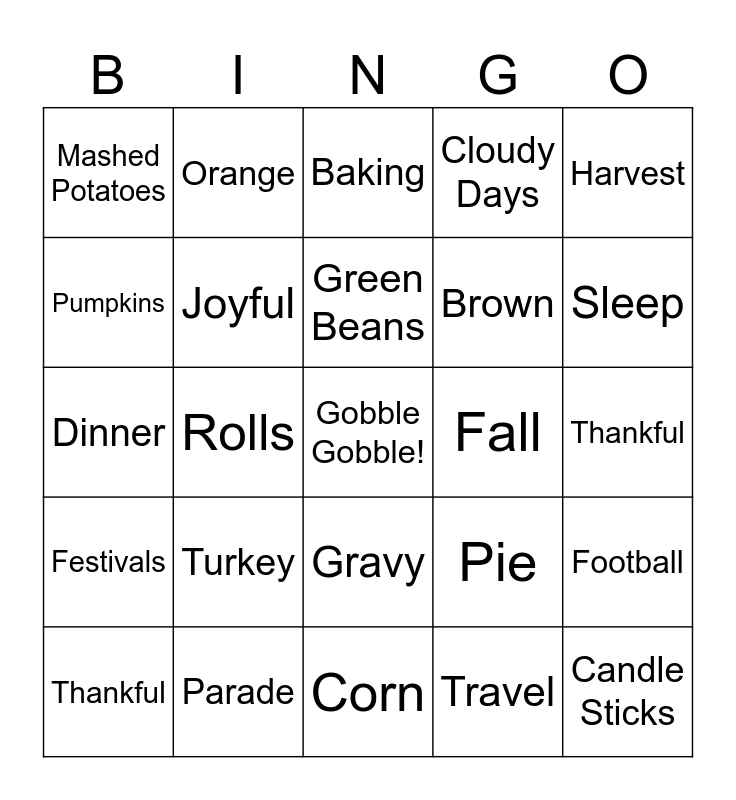 This bingo card has a free space and 24 words: Turkey, Parade, Green Beans, Thankful, Harvest, Mashed Potatoes, Pumpkins, Orange, Fall, Gravy, Brown, Dinner, Pie, Football, Joyful, Travel, Thankful, Baking, Sleep, Rolls, Candle Sticks, Festivals, Cloudy Days and Corn.