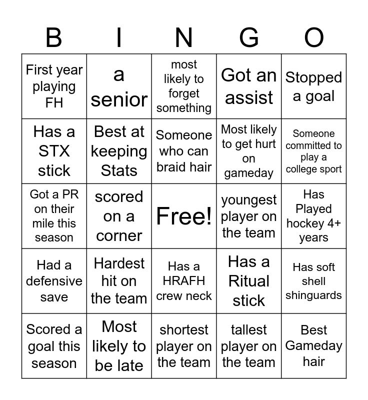 This bingo card has a free space and 24 words: Scored a goal this season, Hardest hit on the team, Someone who can braid hair, tallest player on the team, Stopped a goal, First year playing FH, a senior, most likely to forget something, youngest player on the team, Has Played hockey 4+ years, Got a PR on their mile this season, Best at keeping Stats, Has a Ritual stick, Has soft shell shinguards, Has a STX stick, Most likely to be late, shortest player on the team, Got an assist, Someone committed to play a college sport, Had a defensive save, scored on a corner, Has a HRAFH crew neck, Most likely to get hurt on gameday and Best Gameday hair.