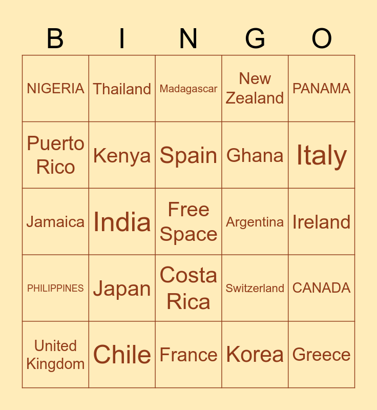 This bingo card has a free space and 24 words: Japan, Chile, Spain, United Kingdom, PANAMA, NIGERIA, Puerto Rico, Thailand, Argentina, Costa Rica, Ghana, Jamaica, Switzerland, CANADA, Kenya, Korea, Ireland, Madagascar, Italy, India, Greece, PHILIPPINES, New Zealand and France.