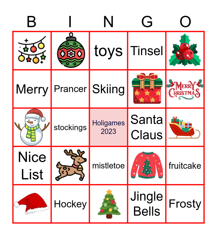 This bingo card has 19 images, a free space and 52 words: Wreath, Tinsel, Frosty, fruitcake, garland, gingerbread, giving, gravy, Grinch, ham, Happy Holidays, Hockey, holly, hot cocoa, Ice Skating, Jingle Bells, jolly, lights, mashed potatoes, Merry, milk & cookies, mistletoe, Naughty List, Nice List, Noel, North Pole, nutcracker, ornaments, Prancer, presents, reindeer, ribbon, Rudolph, Santa Claus, Scrooge, Seasons Greetings, Silent Night, Skiing, sleigh, snow, snowflakes, Snowman, Snowshoeing, stockings, stuffing, sugarplum, tinsel, toys, tradition, turkey, Vixen and wreath.