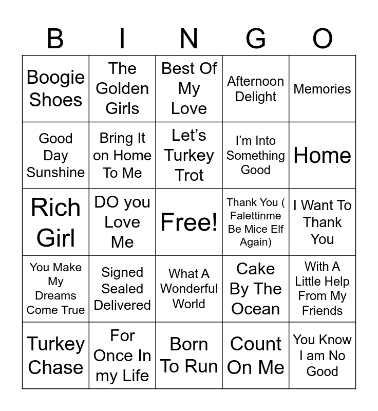 This bingo card has a free space and 63 words: GREENS BEANS POTATOES\, ( Do The ) Mashed Potatoes, Thanksgiving Theme, With A Little Help From My Friends, Apples, Peaches, Pumpkin Pie, Cheeseburger In Paradise, The Golden Girls, We Are Family, Let’s Turkey Trot, Santa Stole Thanksgiving, What A Wonderful World, Give A Little Bit, I Want To Thank You, Memories, You Are The Best Thing, Good Day Sunshine, DO you Love Me, Boogie Shoes, Feelin’ Alright, I’m Into Something Good, Signed Sealed Delivered, You Make My Dreams Come True, Afternoon Delight, Lean On Me, Aint No Mountain High Enough, Wouldn’t It Be Nice, Where Everybody Knows Your Name, If You Wanna be Happy, Stretchy Pants, December 1963, Love Grows, I Feel The Earth Move, I’ll Be There For You, Thank u, Next, Home, Turkey Chase, Lovely Day, Count On Me, Photograph, Bring It on Home To Me, Rich Girl, Thank You ( Falettinme Be Mice Elf Again), Every Breath You Take, Fly Me To The Moon, You Know I am No Good, For Once In my Life, The Safety Dance, Cake By The Ocean, Jumpin’ Jack Flash, Escape, American Pie, Born To Run, Maybellene, Gratitude, Piano Man, Best Of My Love, Got to Get You Into My Life, Where You Lead, Heartbreak Hotel, Brown Eyed Girl, I can’t Help Myself, Do You Believe in Magic? and The Longest Time.