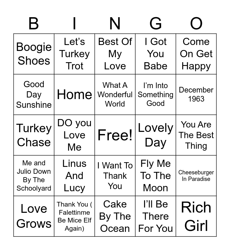 This bingo card has a free space and 64 words: Thanksgiving Theme, With A Little Help From My Friends, Apples, Peaches, Pumpkin Pie, Cheeseburger In Paradise, The Golden Girls, We Are Family, Let’s Turkey Trot, Santa Stole Thanksgiving, What A Wonderful World, Give A Little Bit, I Want To Thank You, Memories, You Are The Best Thing, Come On Get Happy, I Can See Clearly Now, Good Day Sunshine, DO you Love Me, Boogie Shoes, Feelin’ Alright, I’m Into Something Good, Linus And Lucy, Me and Julio Down By The Schoolyard, I Got You Babe, Kokomo, Cecilia, Signed Sealed Delivered, You Make My Dreams Come True, Afternoon Delight, Lean On Me, Aint No Mountain High Enough, Wouldn’t It Be Nice, Where Everybody Knows Your Name, If You Wanna be Happy, Stretchy Pants, December 1963, Love Grows, I Feel The Earth Move, I’ll Be There For You, Thank u, Next, Home, Turkey Chase, Lovely Day, Count On Me, Photograph, Bring It on Home To Me, Rich Girl, Thank You ( Falettinme Be Mice Elf Again), Every Breath You Take, Fly Me To The Moon, You Know I am No Good, For Once In my Life, The Safety Dance, Cake By The Ocean, Maybellene, Gratitude, Piano Man, Best Of My Love, Got to Get You Into My Life, Where You Lead, Heartbreak Hotel, Brown Eyed Girl, I can’t Help Myself, Do You Believe in Magic? and The Longest Time.