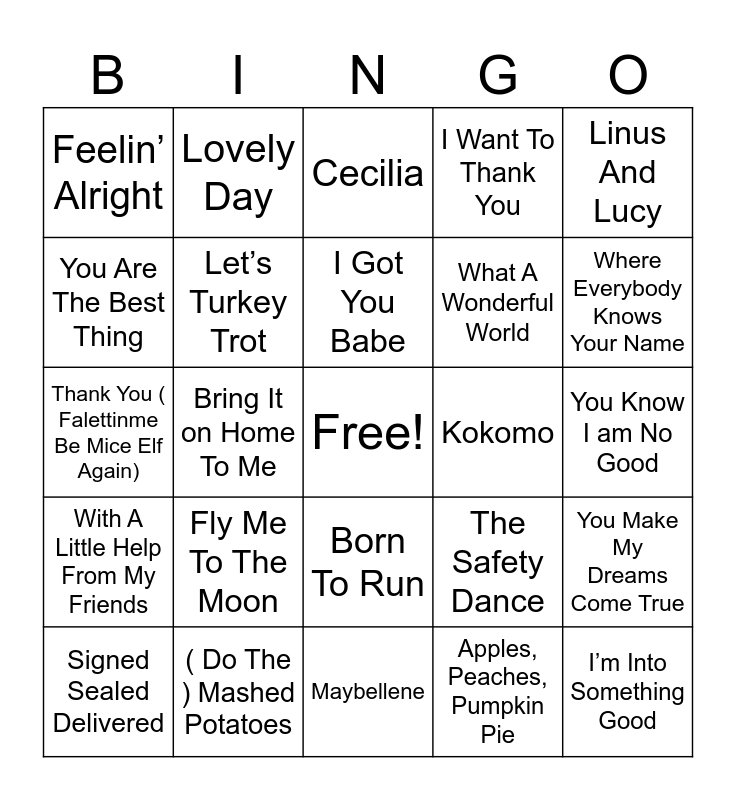 This bingo card has a free space and 61 words: GREENS BEANS POTATOES\, ( Do The ) Mashed Potatoes, Thanksgiving Theme, With A Little Help From My Friends, Apples, Peaches, Pumpkin Pie, We Are Family, Let’s Turkey Trot, Santa Stole Thanksgiving, What A Wonderful World, Give A Little Bit, I Want To Thank You, Memories, You Are The Best Thing, Come On Get Happy, I Can See Clearly Now, Feelin’ Alright, I’m Into Something Good, Linus And Lucy, Me and Julio Down By The Schoolyard, I Got You Babe, Kokomo, Cecilia, Signed Sealed Delivered, You Make My Dreams Come True, Afternoon Delight, Lean On Me, Aint No Mountain High Enough, Wouldn’t It Be Nice, Where Everybody Knows Your Name, If You Wanna be Happy, Stretchy Pants, December 1963, Home, Turkey Chase, Lovely Day, Count On Me, Photograph, Bring It on Home To Me, Rich Girl, Thank You ( Falettinme Be Mice Elf Again), Every Breath You Take, Fly Me To The Moon, You Know I am No Good, For Once In my Life, The Safety Dance, Cake By The Ocean, Jumpin’ Jack Flash, Escape, American Pie, Born To Run, Maybellene, Gratitude, Piano Man, Best Of My Love, Got to Get You Into My Life, Where You Lead, Heartbreak Hotel, Brown Eyed Girl, I can’t Help Myself, Do You Believe in Magic? and The Longest Time.