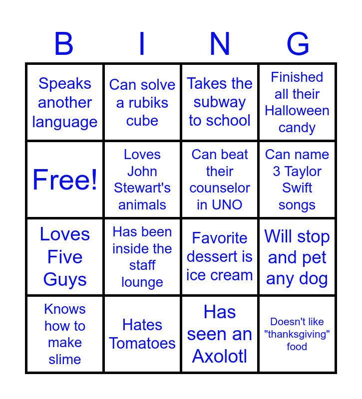 This bingo card has 16 words: Hates Tomatoes, Will stop and pet any dog, Takes the subway to school, Speaks another language, Loves Five Guys, Can solve a rubiks cube, Favorite dessert is ice cream, Has seen an Axolotl, Free!, Loves John Stewart's animals, Knows how to make slime, Finished all their Halloween candy, Has been inside the staff lounge, Can name 3 Taylor Swift songs, Can beat their counselor in UNO and Doesn't like "thanksgiving" food.
