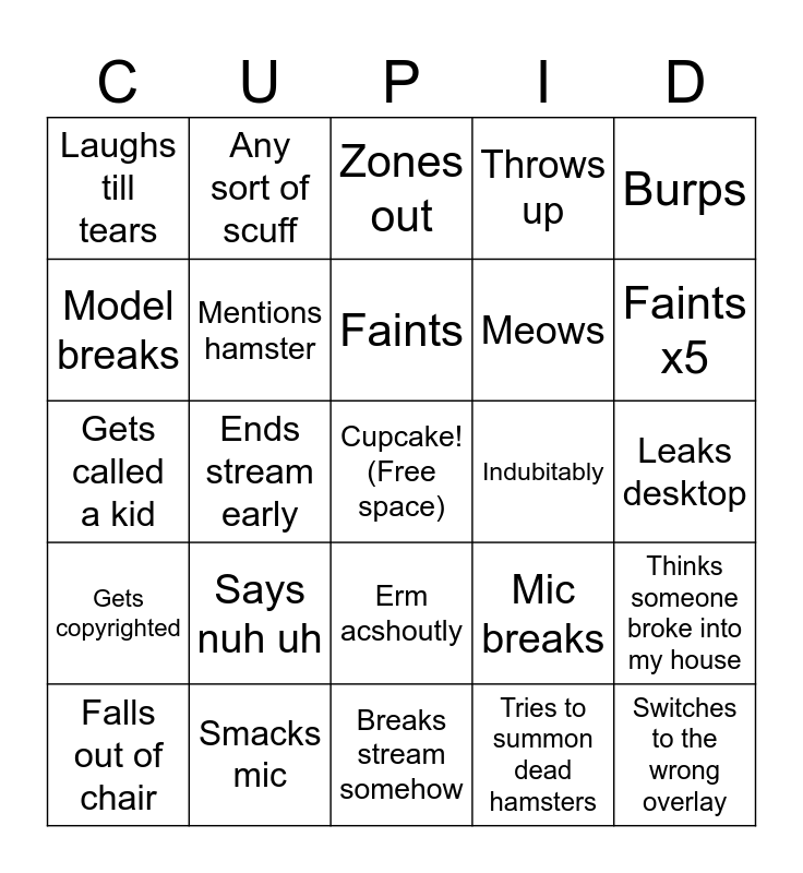 This bingo card has a free space and 24 words: Says nuh uh, Smacks mic, Faints, Falls out of chair, Burps, Laughs till tears, Model breaks, Any sort of scuff, Indubitably, Erm acshoutly, Meows, Gets called a kid, Mic breaks, Thinks someone broke into my house, Mentions hamster, Tries to summon dead hamsters, Leaks desktop, Zones out, Faints x5, Ends stream early, Switches to the wrong overlay, Gets copyrighted, Throws up and Breaks stream somehow.