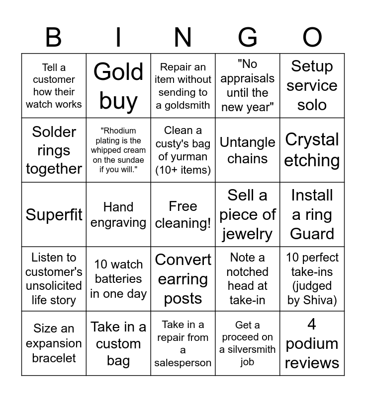 This bingo card has a free space and 24 words: 10 watch batteries in one day, Take in a custom bag, Clean a custy's bag of yurman (10+ items), Size an expansion bracelet, Setup service solo, Tell a customer how their watch works, Solder rings together, Gold buy, Sell a piece of jewelry, Convert earring posts, Untangle chains, Superfit, Note a notched head at take-in, 10 perfect take-ins (judged by Shiva), "Rhodium plating is the whipped cream on the sundae if you will.", Get a proceed on a silversmith job, Install a ring Guard, Repair an item without sending to a goldsmith, Crystal etching, Hand engraving, 4 podium reviews, Listen to customer's unsolicited life story, "No appraisals until the new year" and Take in a repair from a salesperson.