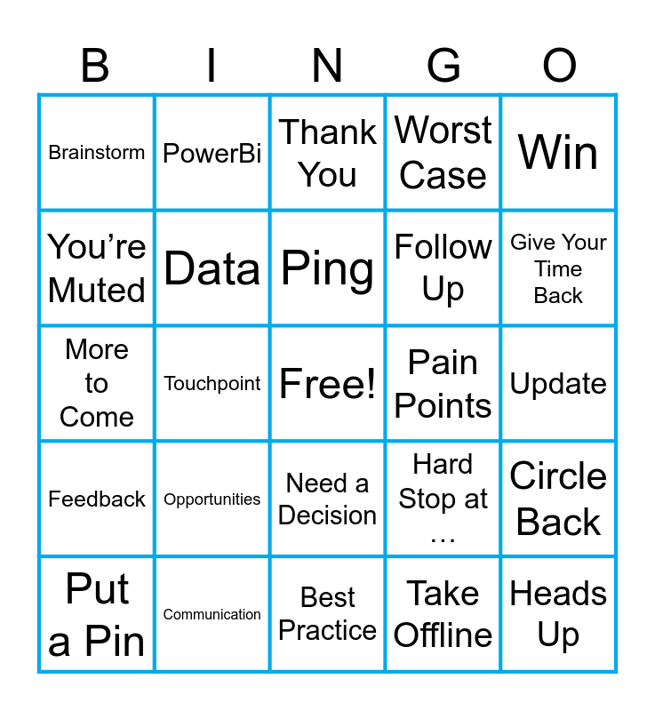 This bingo card has a free space and 40 words: CC Me, More to Come, Hand Slap, Data, Communication, Need a Decision, Ping, Email, Win, Feedback, Touchpoint, Worst Case, Heads Up, Update, Pain Points, Opportunities, Connect Dots, Brainstorm, Metrics, Thank You, Circle Back, Take Offline, Follow Up, You’re Muted, Drill Down, Growth, Sorry, Go Ahead, Next Slide, Look Into It, I Have to Drop, ‘Awkward Silence’, Put a Pin, Put it in Chat, Hard Stop at …, Give Your Time Back, Best Practice, Standardize, Compliance, PowerBi and Dashboard.
