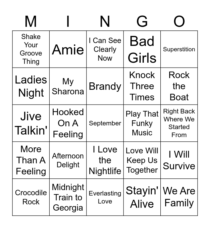 This bingo card has a free space and 34 words: Don't Go Breaking My Heart, Stayin' Alive, Dancing Queen, Boogie Wonderland, More Than A Feeling, My Sharona, Superstition, Crocodile Rock, Amie, It Never Rains in Southern California, Brandy, I Can See Clearly Now, Boogie Nights, Don't Fear the Reaper, Play That Funky Music, Rock the Boat, Midnight Train to Georgia, Jive Talkin', Afternoon Delight, Love Will Keep Us Together, I Love the Nightlife, Disco Inferno, Shake Your Groove Thing, Right Back Where We Started From, Everlasting Love, We Are Family, Bad Girls, I'm Every Woman, Knock Three Times, Ladies Night, Signed, Sealed Delivered, Hooked On A Feeling, I Will Survive and You Make Me Feel Like Dancing.