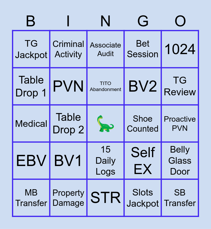 This bingo card has a free space and 24 words: MB Transfer, BV1, TITO Abandonment, Slots Jackpot, 1024, TG Jackpot, Criminal Activity, Associate Audit, Shoe Counted, Proactive PVN, Medical, PVN, Self EX, Belly Glass Door, Table Drop 1, Property Damage, STR, Bet Session, TG Review, EBV, Table Drop 2, 15 Daily Logs, BV2 and SB Transfer.