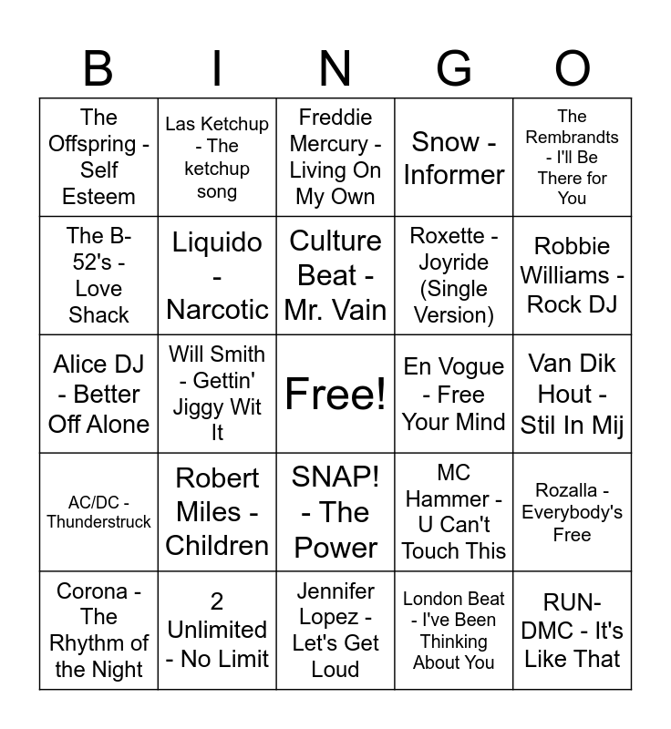This bingo card has a free space and 58 words: Dr Alban - Sing Hallelujah!, 2 Unlimited - No Limit, Spice Girls - Wannabe, AC/DC - Thunderstruck, London Beat - I've Been Thinking About You, Lenny Kravitz - Always On The Run, Liquido - Narcotic, Michael Jackson - Black or White, Roxette - Joyride (Single Version), Seal - Killer, Snow - Informer, Spin Doctors - Two Princes, 2 Brothers On The 4th Floor - Never Alone, Backstreet Boys - Everybody, Nirvana - Smells Like Teen Spirit, The Offspring - Self Esteem, RUN-DMC - It's Like That, The Rembrandts - I'll Be There for You, R.E.M. - Losing My Religion, Culture Beat - Mr. Vain, En Vogue - Free Your Mind, Freddie Mercury - Living On My Own, Corona - The Rhythm of the Night, Rozalla - Everybody's Free, Paradisio - Bailando, Van Dik Hout - Stil In Mij, Total Touch - Touch Me There, Robin S - Show Me Love, Robbie Williams - Rock DJ, Ultimate Kaos - Casanova, Anouk - Nobody's Wife, Faithless - Insomnia (Radio Edit), Lou Bega - Mambo No. 5, The Bucketheads - The Bomb, Undercover - Baker Street, Crystal Waters - Gypsy Woman, Britney Spears - ...Baby One More Time, Will Smith - Gettin' Jiggy Wit It, Alice DJ - Better Off Alone, Leila K - Open Sesame, Robert Miles - Children, C & C Music Factory - Gonna Make You Sweat, MC Hammer - U Can't Touch This, EMF - Unbelievable, Reel 2 Real - I Like To Move It, MC Hammer - U Can't Touch This, Five - Everybody Get Up, SNAP! - The Power, Jennifer Lopez - Let's Get Loud, Leila K - Open Sesame, Bloodhound Gang - The Bad Touch, Livin' Joy - Dreamer, The Course - Ready Or Not, The Prodigy - Out of Space, Las Ketchup - The ketchup song, Heavy D & The Boyz - Now That We Found Love, The B-52's - Love Shack and Marky Mark And The Funky Bunch - Good Vibrations.