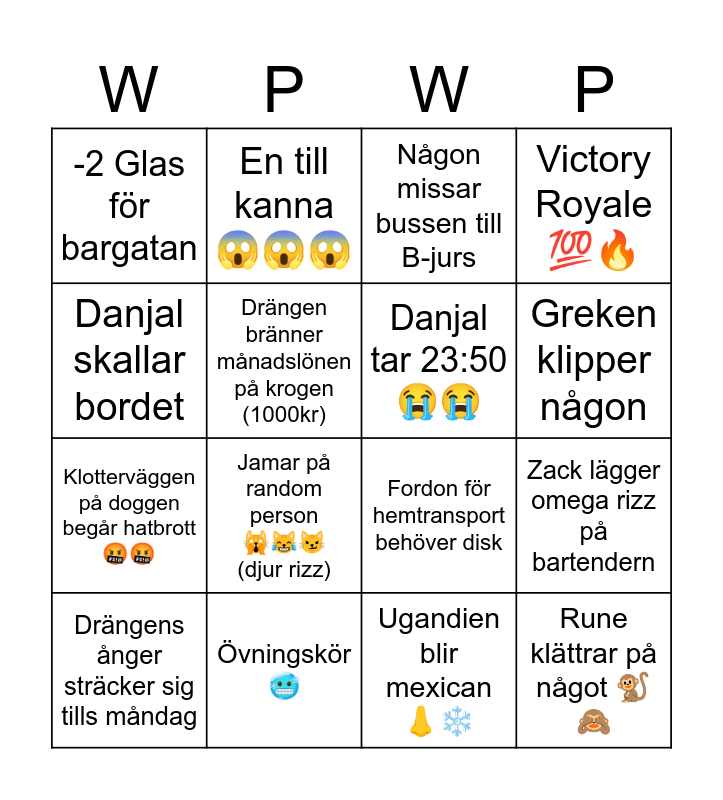 This bingo card has 26 words: Drängis raggar upp gorlock, Nån bjuds på kroppsvätskor, Greken klipper någon, Saros The Predator står på väggen, Danjal skallar bordet, -2 Glas för bargatan, Drängen bränner månadslönen på krogen (1000kr), En till kanna 😱😱😱, Ugandien blir mexican 👃❄️, Isac är med ut?!? 😱, Klotterväggen på doggen begår hatbrott 🤬🤬, Fordon för hemtransport behöver disk, Någon sossar sig på Emil pommes, SA, Zack lägger omega rizz på bartendern, Någon spyr i parken, Victory Royale 💯🔥, Rune klättrar på något 🐒🙈, Någon missar bussen till B-jurs, Drängens ånger sträcker sig tills måndag, Jamar på random person 🙀😹😼 (djur rizz), Sågmyra pitstop 🎇, Övningskör 🥶, Hets mot folkgrupp (verbalt), Danjal tar 23:50 😭😭 and Falukuriren 📰💯.