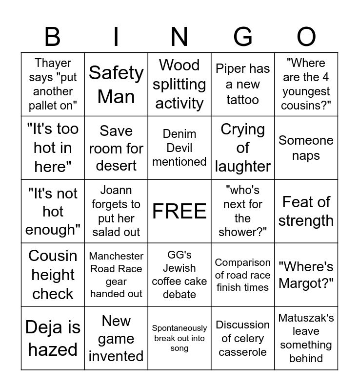 This bingo card has a free space and 24 words: Manchester Road Race gear handed out, New game invented, Denim Devil mentioned, Deja is hazed, "Where are the 4 youngest cousins?", Thayer says "put another pallet on", "It's too hot in here", Safety Man, "who's next for the shower?", GG's Jewish coffee cake debate, Crying of laughter, "It's not hot enough", Comparison of road race finish times, "Where's Margot?", Save room for desert, Discussion of celery casserole, Feat of strength, Wood splitting activity, Someone naps, Joann forgets to put her salad out, Matuszak's leave something behind, Cousin height check, Piper has a new tattoo and Spontaneously break out into song.