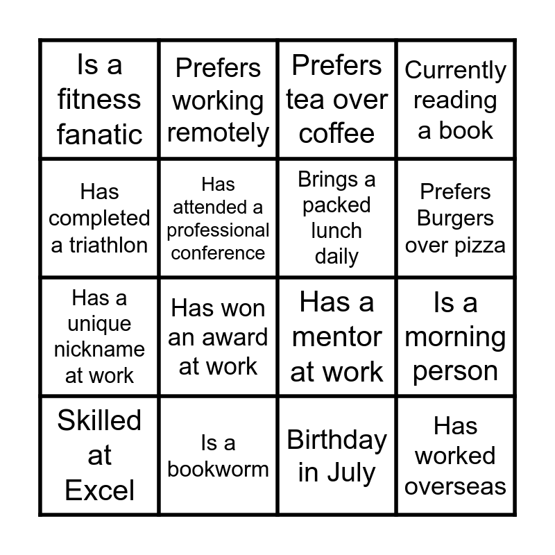 This bingo card has 20 words: Is a morning person, Has completed a University degree, Prefers tea over coffee, Has a collection hobby, Skilled at Excel, Has completed a triathlon, Is a bookworm, Is a fitness fanatic, Has a unique nickname at work, Prefers working remotely, Has won an award at work, Has a mentor at work, Has attended a professional conference, Has worked overseas, Brings a packed lunch daily, Enjoys puzzles, Prefers Burgers over pizza, Currently reading a book, Birthday in July and Thinks 70s music is better then 80s.