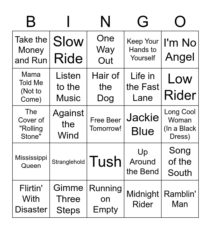 This bingo card has a free space and 44 words: Freebird, Ramblin' Man, Sweet Home Alabama, Flirtin' With Disaster, Caught Up In You, Midnight Rider, One Way Out, The Devil Went Down to Georgia, I'm No Angel, Gimme Three Steps, Keep Your Hands to Yourself, Jackie Blue, Tush, Stranglehold, Lookin' Out My Back Door, Running on Empty, Fishing In the Dark, The Cover of "Rolling Stone", Sweet Emotion, Low Rider, Slow Ride, Rock and Roll, Hoochie Koo, Free Ride, Take the Money and Run, Fortunate Son, Long Cool Woman (In a Black Dress), Black Water, The Weight, Up Around the Bend, Mississippi Queen, La Grange, Song of the South, Dixieland Delight, Mountain Music, Against the Wind, Night Moves, Old Time Rock & Roll, Call Me the Breeze, Hair of the Dog, Mama Told Me (Not to Come), Life in the Fast Lane, Can’t You See, Listen to the Music and One Bourbon, One Scotch, One Beer.