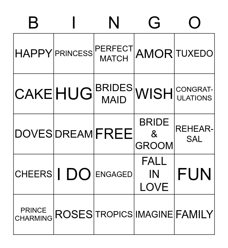 This bingo card has a free space and 24 words: I DO, ROSES, BRIDES MAID, PRINCE CHARMING, TUXEDO, HAPPY, CAKE, PRINCESS, BRIDE & GROOM, ENGAGED, WISH, DOVES, FALL IN LOVE, FUN, HUG, IMAGINE, REHEAR- SAL, PERFECT MATCH, CONGRAT- ULATIONS, DREAM, FAMILY, CHEERS, AMOR and TROPICS.